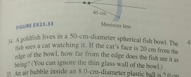 The fish sees a cat watching it. A goldfish lives in a spherical fish bowl. Answer to a goldfish lives in a 50 cm diameter spherical fish bowl. You can ignore the thin glass wall of the bowl.