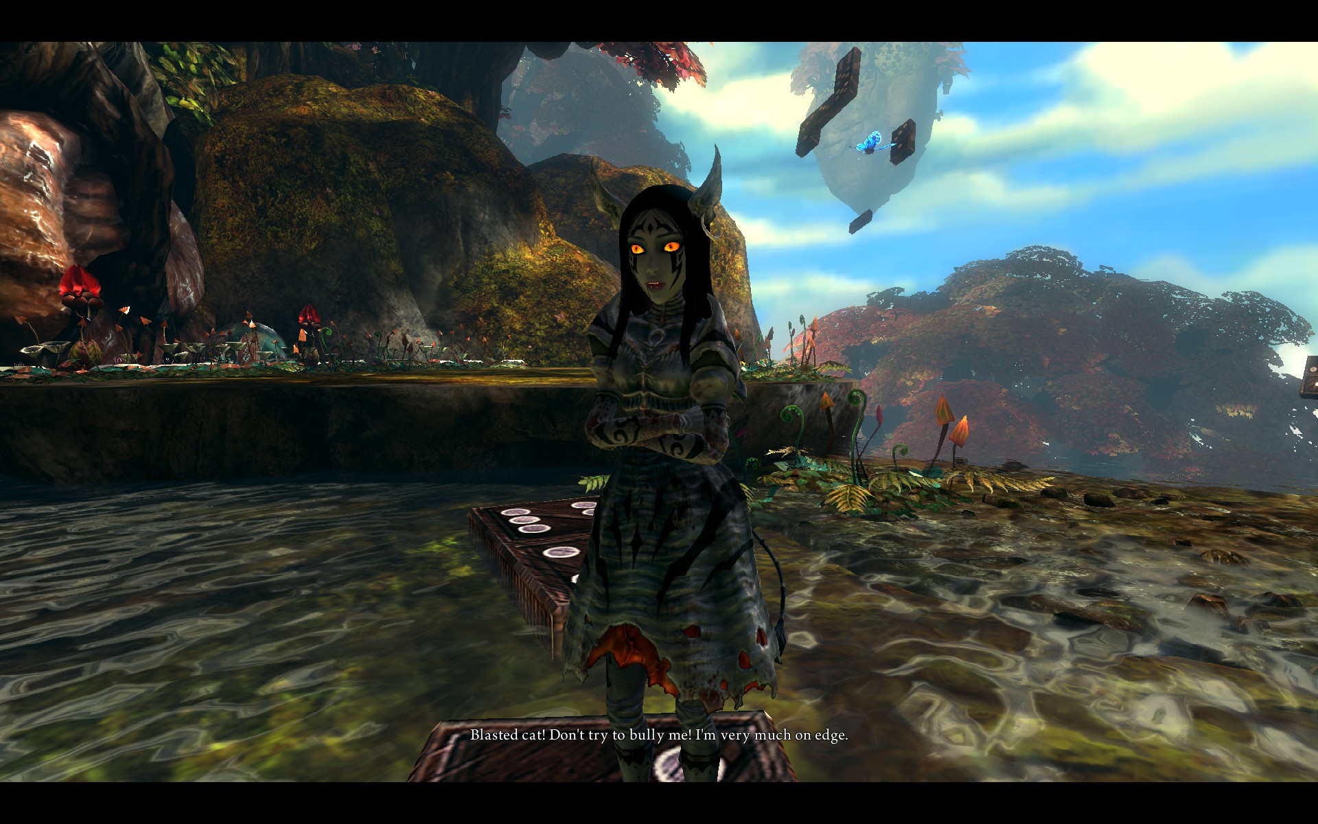 Alice can wear a dress based on cheshire cat as dlc in madness returns. Otherlands showing that alices psyche is overlapping with jules verne. Alices eyes and irises are yello.
