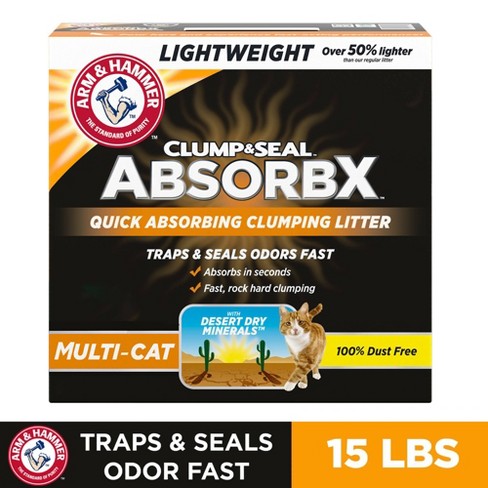 Our unscented formula delivers powerful odor control specially formulated for fragrance sensitive cats and owners. Arm hammer absorbx is quick absorbing clumping litter made with all new desert dry minerals that quickly absorb wetness and odors. This cat litter combines powerful ammonia neutralizers and baking soda crystals to eliminate the toughest odors. The clump and seal lightweight makes lifting the litter effortless.