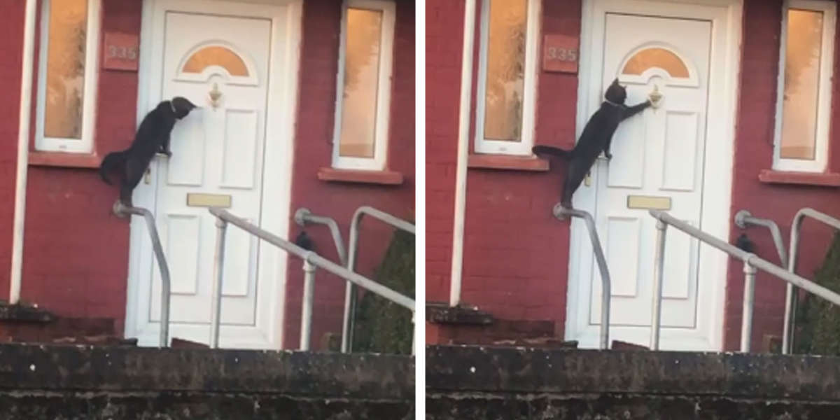 Its just a fact. As you can see the cat sits perched on the handrail leading up to the white door of. In the footage the black cat perches on the stair railing of the homes residence with its back two legs leaning its front two paws onto the door handle. See more ideas about door knobs and knockers door knockers doorknockers.