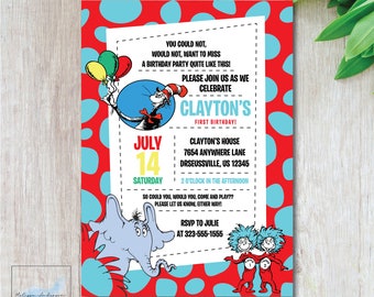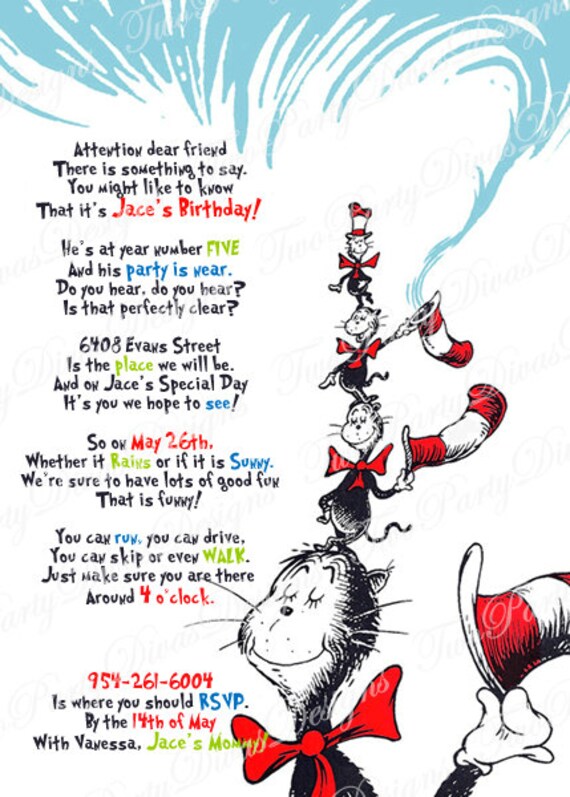 These 4x6 or 5x7 customized invitations are created using your favorite photos and personalized wording. Featuring decorations and party favors printed with images of the cat in the hat horton and other favorite dr. Check out our cat in the hat invitations selection for the very best in unique or custom handmade pieces from our invitations shops. The party also will served cat in the hat sculpture which made from tied balloons.