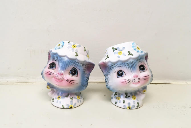 Vintage blue cat in basket salt and pepper shakers with matching napkin holder. Vintage salt pepper shakers set they were made mid century in japan. Make offer vintage 1950s celluloid plastic kitten cat salt pepper shaker shakers meow black and white modern kitty cat salt and pepper shakers 35 849. The shakers are in the shape of cats wearing pastel colored scarves and have colorful flowers around their bases.