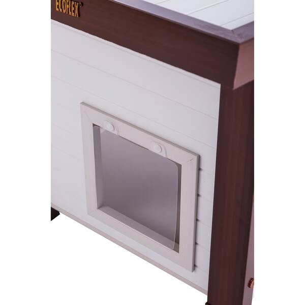 Ecoflex albany cat shelter. W x 37 in. Specially designed with 2 doors. Best of all its made of ecoflex which is a composite blend of recycled polymers and reclaimed post industrial poplar waste and by products.