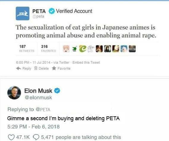 Musk is well known for his attention grabbing publicity stunts including this years launch of a personal flamethrower retailing at 500 and launching a car into space to promote his spacex business. Unfortunately as far as we can tell this next tweet about genetically engineered cat girls is fake. Cat girls are possible but we lack funding elon musk.