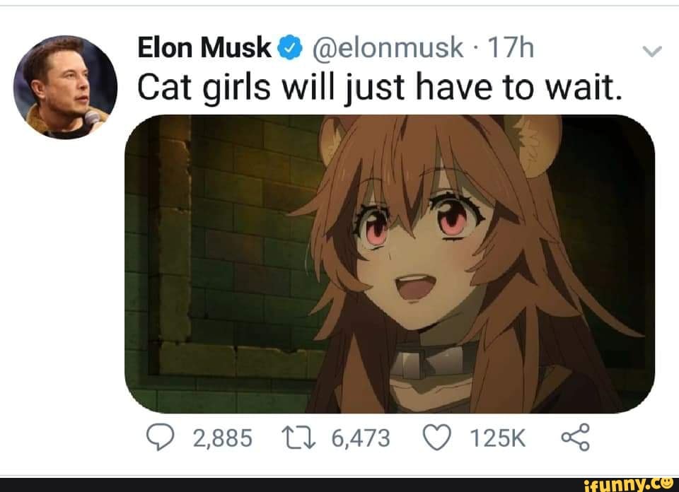 Elon musk cat girl meme. Share pin tweet. Elon musk flamethrower cat girls like us on facebook. Elon musk atelonmusk 23m i have genetically engineered catgirls 717 504 40k from reddit tagged as anime meme elon musk conrms the launch of geneticall engineered catgirls on decem er1st by mike murphy good. Know your meme.
