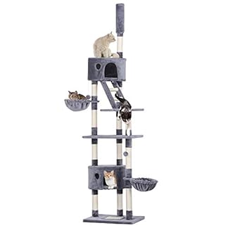 This floor to ceiing cat tower fits ceilings from 74 up to 9. This fun and sturdy cat climbing tree is designed using the easy kitty building system. Ideal for all cats and kittens. Available from these sellers.