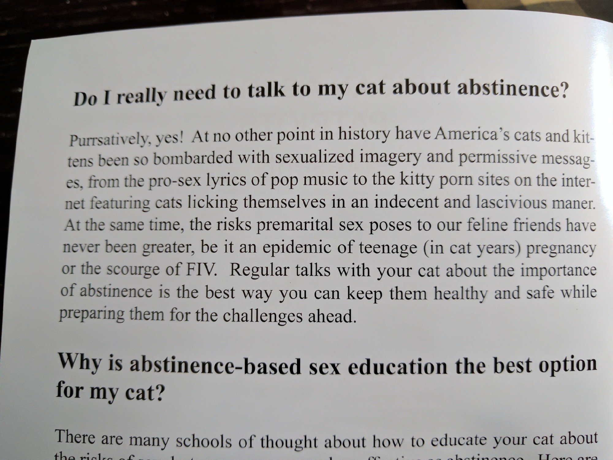 Youve talked to your cat about gun safety and evolution but you still need to have the talk. In reality it is a very cheeky poke at the view that no sex is the only way to keep the youth of today safe. These questions and more are addressed in the briefly stated but highly purr tinent pamphlet how to talk to your cat about abstinence an informative little book disclosing the ins and outs of cat coaching regarding the sex life of your feline companions. Shop from millions of books directly from atlantic.