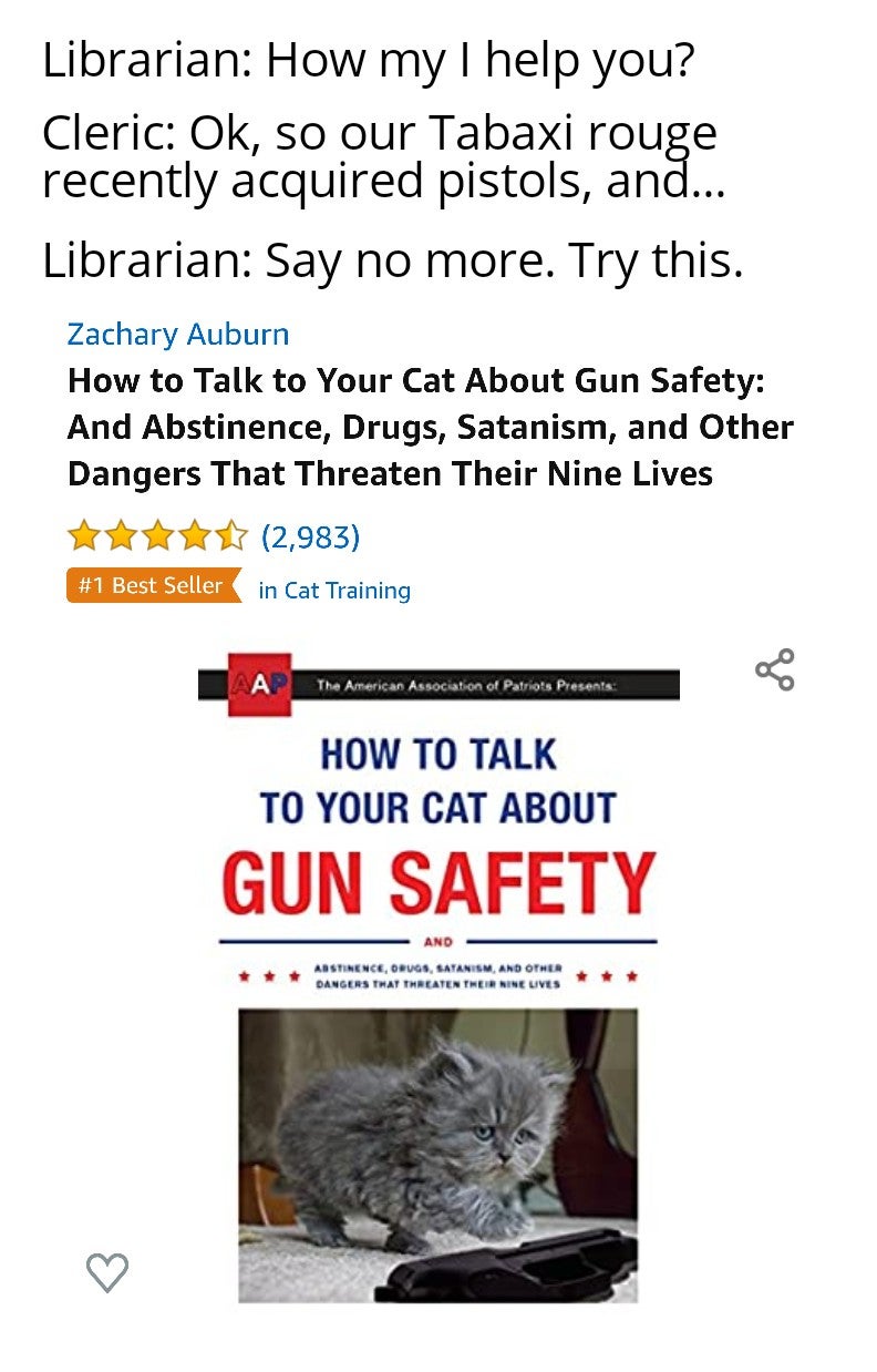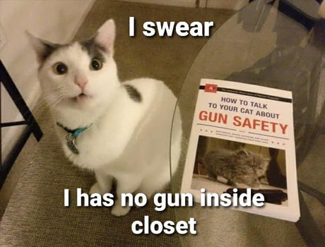How to talk to your cat about gun safety meme. How to talk to your cat about gun safety pamphlet january 1 2013 44 out of 5 stars 30 ratings. So my cat finds a gun whats the big deal and things like that. Easy to see why i had to pick it up and check it out right. This book is incredibly good and funny and will help you teach your cat how to survive this weird age.