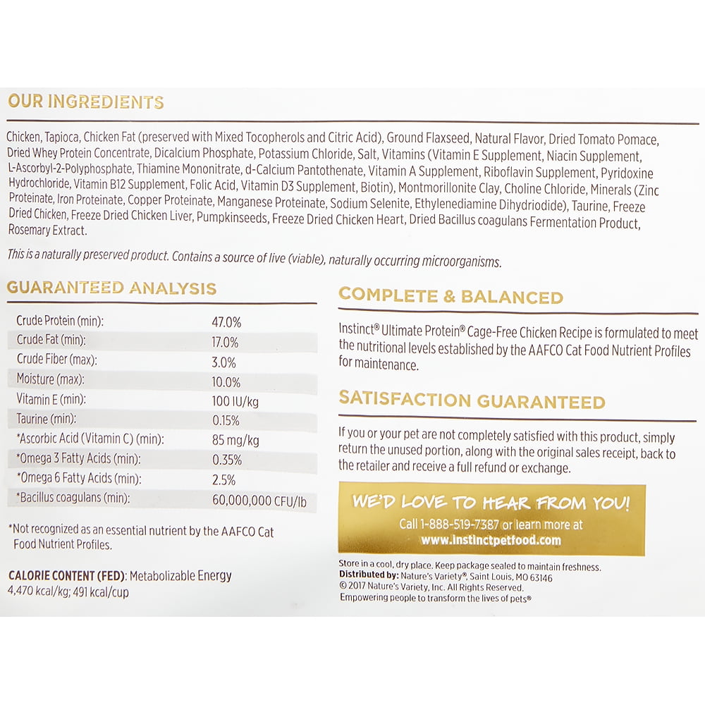 Instinct ultimate protein cat food. Add wet for variety and mealtime excitement our grain free wet recipes are made with cage free poultry grass fed meats or wild caught fish plus real vegetables and fruits. Instinct limited ingredient diet. About this item high protein grain free cat food with cage free chicken. Instinct wet grain free high protein recipes made with real meat fruits and vegetables.