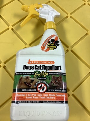 Liquid fence dog and cat repellent. Dog cat repellent ready to use2 pets and strays will habitually visit the same areas seeking familiar animal scents to perform their duties when liquid fence dog cat repellent ready to use 2 is sprayed in these areas it will mask the familiar odors causing the animals to become uneasy thus repelling them. Protect your lawn and garden from dogs and cats. When liquid fence dog and cat repellent ready to use2 is sprayed in these areas it will mask the familiar odors causing the animals to become uneasy thus repelling them. Liquid fence 32 oz.