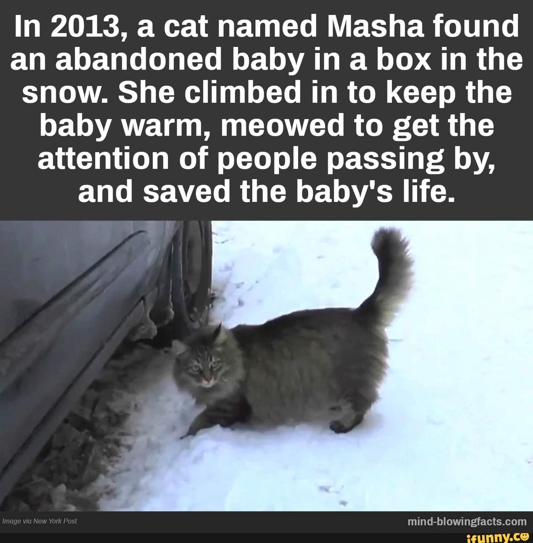 Masha the cat saves baby. According to resident irina lavrova masha climbed into a box where the infant was dumped in and kept the baby warm for hours. Russias heroic cat masha. And she knew masha was normally very calm and friendly. Masha lives in a community in russia and is fed and cared for by the local residents.