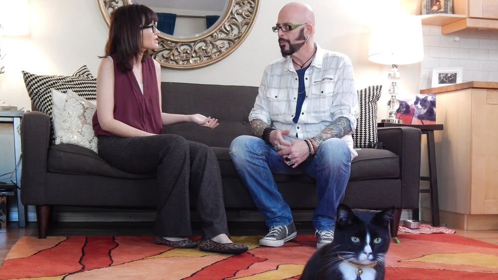 He virtually meets a couples ferocious felines and a familys cat who is eager to escape.
