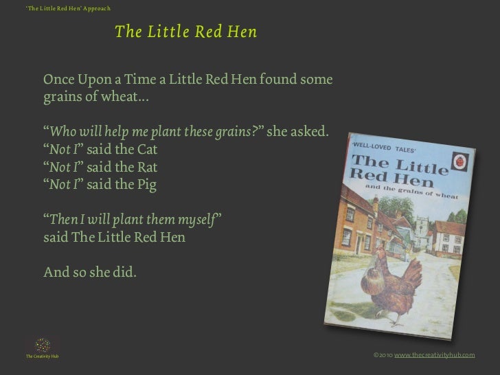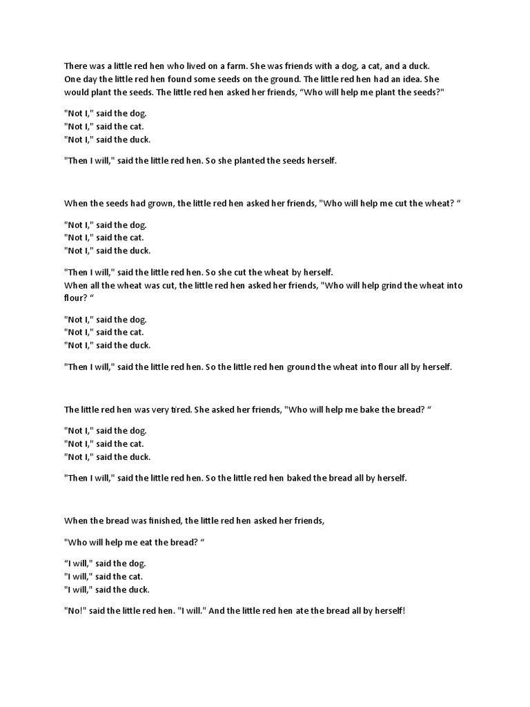 A hen living on a farm finds some wheat and decides to make bread with it. So guess who eats the cake by herself in the end. Little red hen found a grain of wheat. She asks the other farmyard animals for help planting it but they refuse.
