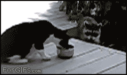 Racoon steals cat food gif awesome cats racoon steals cat food gif. Animated gifs animal gifs raccoon steals cat food.