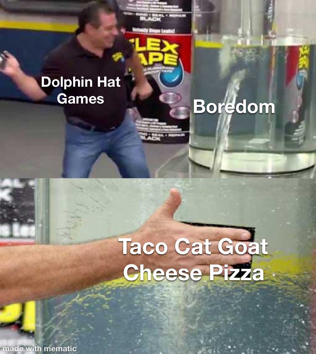Each player places a card from their hand like snap and dobble face up in a community pile while saying tacocatgoatcheesepizza in player sequence when the card matches the mantra boom everyone slaps their hand on the deck the last one picks up the cards the winner is the player to lose all their cards first. Each player lays one of their cards down face up and recites the next word in the games title. What do the words taco cat goat cheese and pizza have in common. Its fast fun friendlythe dolphin hat way.
