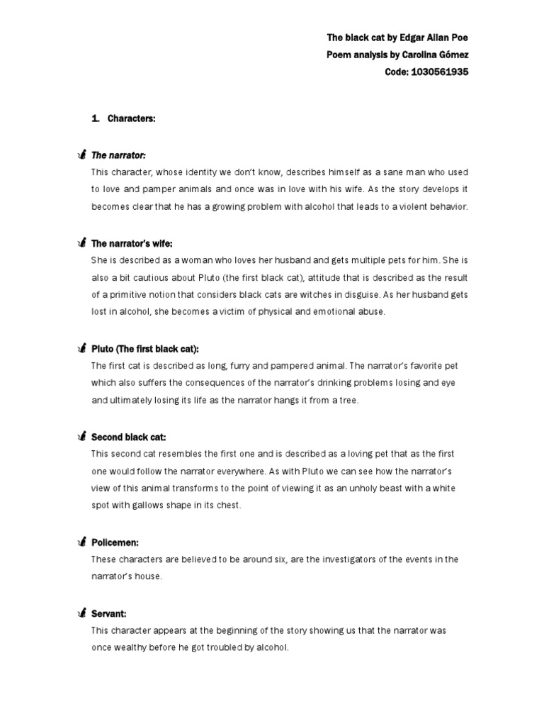The black cat edgar allan poe analysis. The narration of this story is in the first person which would lead you to believe the narrator could be trusted to relate to you the true events of the story but this is false. The black cat analysis. Analysis of edgar allan poes the black cat edgar allan poe wrote that the single effect was the most important aspect of a short story which everything must contribute to this effect. Setting writing style symbolism imagery allegory narrator point of view bookers seven basic plots analysis plot analysis three act plot analysis.