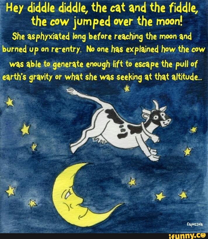I always pondered particularly at the line the cow jumped over the moon thinking it was just silly little nursery rhyme to pacify children who would not want to go to sleep. Hey diddle diddle the cat and the fiddle the cow jumped over the moon. The little dog laugh to see such fun and the dish ran away with the sp. Time to go.