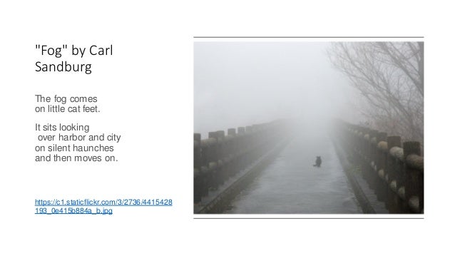 The fog comes on little cat feet figurative language. The type of figurative language that compares two things using the words like or as define metaphor identify the type of figurative language used in the text below. In his youth he worked many odd jobs before serving in the 6th illinois infantry in puerto rico during the spanish american war. The poet creates comparisons between unrelated objects such as fog on little cat feet and harbor and city. The reader of fog can imagine the fog almost creeping around on its little cat feet as it begins to enter the space in this case the harbor and city the fog then simply sits on its silent.