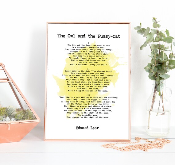 The owl and the pussy cat by edward lear is a simple joy filled poem that tells the marriage story of an owl and a cat. One of many verses from an anthology of much loved poems from the english speaking world that includes important work from major poets memorable lines sources for study guides and poetry for every occasion and mood verse that can inspire you and rhymes that you remember from your childhood. They took some honey and plenty of money wrapped up in a five pound note. The owl and the pussy cat went to sea in a beautiful pea green boat they took some honey and plenty of money wrapped up in a five pound note.