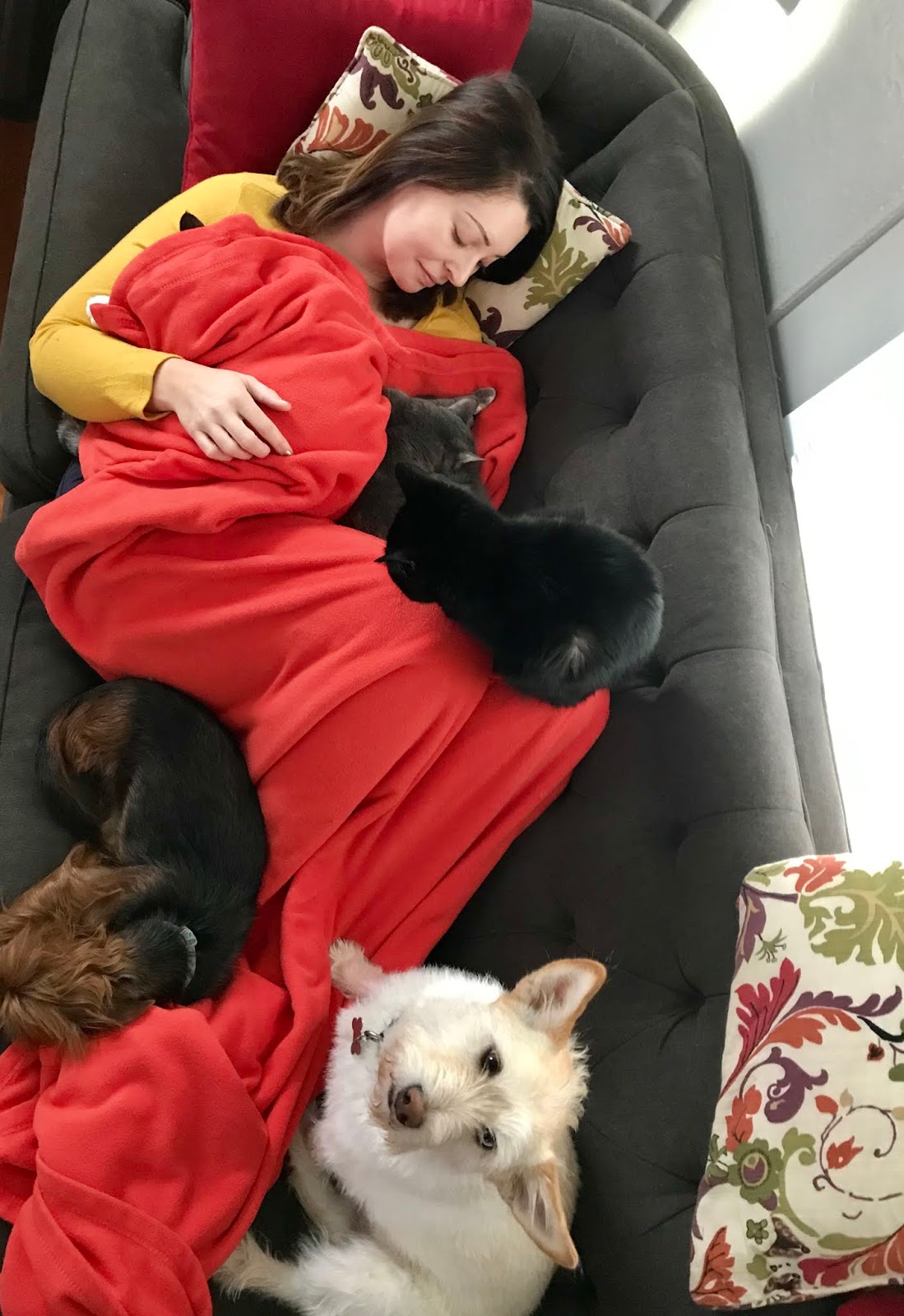 Two dogs and a cat on a couch. You have to give a walk to your dog before introducing the dog and cat to each other then tie the dog before meeting the cat or make sure that you are in complete control of him because the cat might run away so you have to control him to not follow her but you also have to take care and set up safety stuff like creating a box and let the cat know its place so she can hide if its necessary and for it to be in high places that your dog cant reach. While your best bet is to train your animals to not jump on furniture or claw it sometimes you are stuck between a rock and a hard place. First time customers get 10 off of their price. Sometimes a cat peeing on the bed or couch is the cat parents fault.