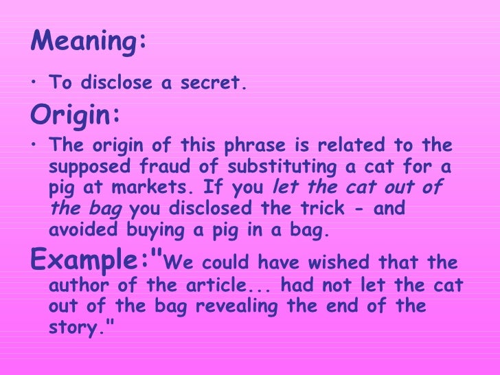 One relates to the fraud of substituting a cat for a piglet at markets. Let the cat out of the bag definition. To allow a secret to be known usually without intending to. Rick was planning to surprise his wife with a trip to japan a place that shes always wanted to visit.