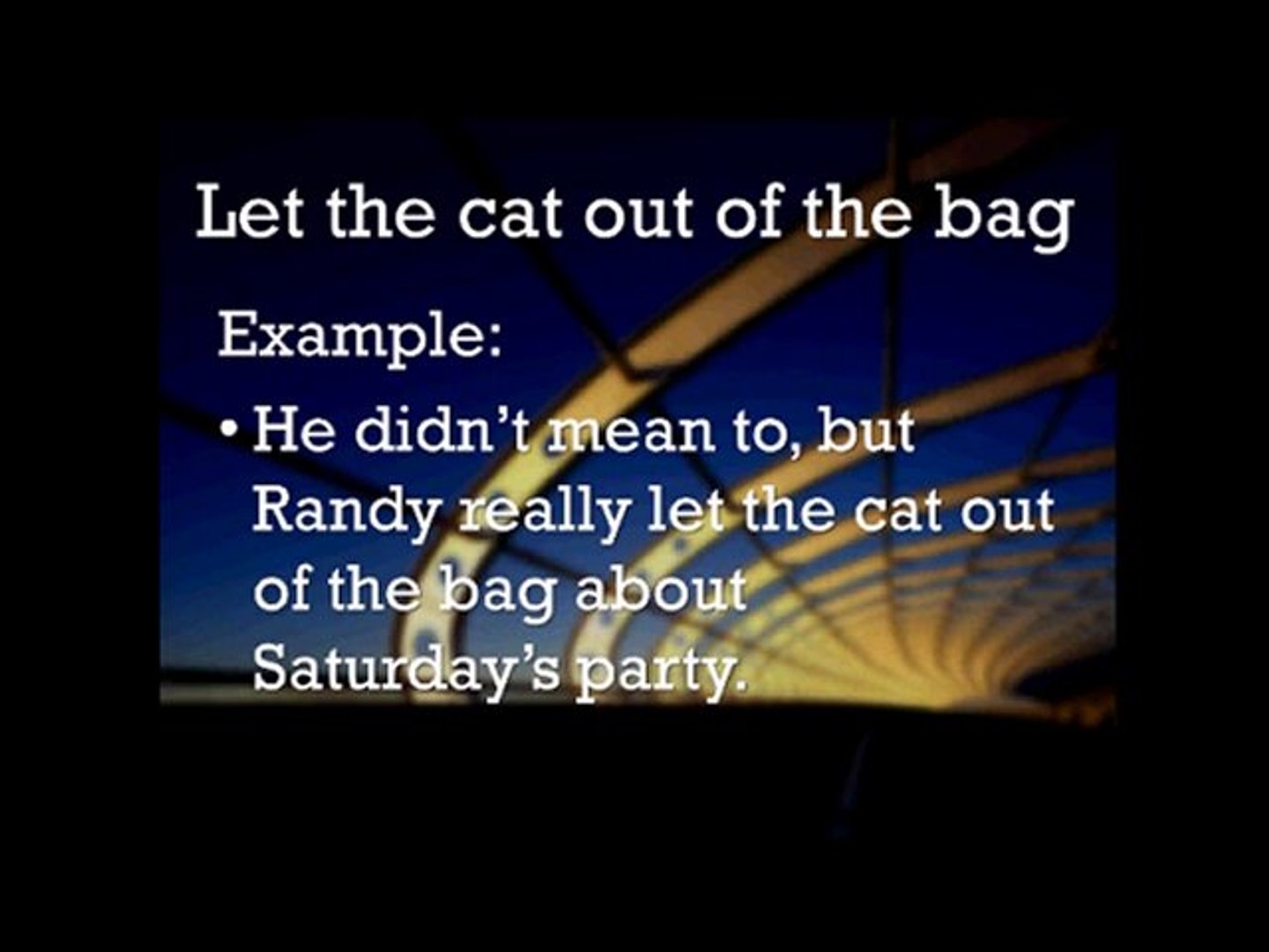 What does let the cat out of the bag mean. To reveal a secret accidentally. He was supposed to keep this a secret until next week but he let the cat out of the bag early because he was so excited and wanted her to know. To let the cat out of the bag is to disclose a secret either deliberately or inadvertently. As the story goes shady livestock vendors in medieval marketplaces sought to swindle their.