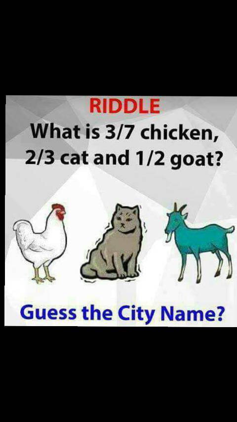 Its a city name. Riddles short riddles tricky riddles what am i riddles. Check your answer tried enough already. Ias question only 2 could solve this question what is 37 chicken 23 cat and 12 goat.